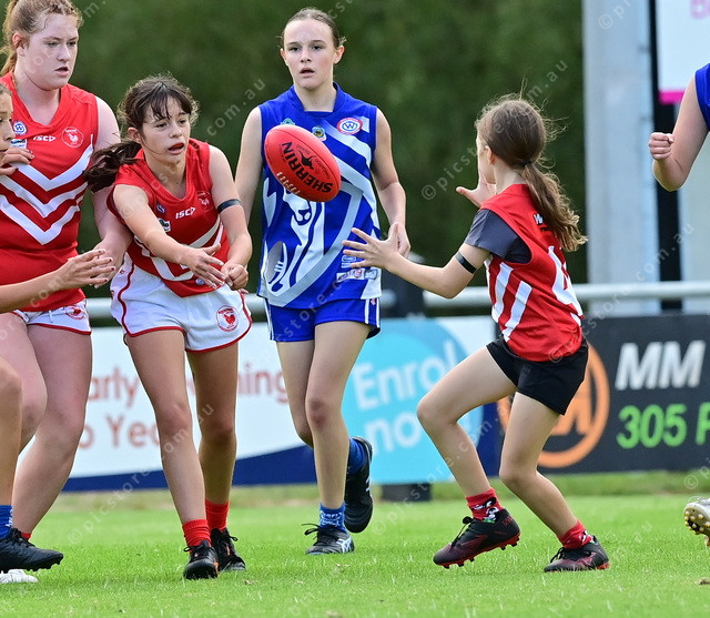Strathalbyn’s Stella Milbank handballs to her teammate Ellira Carman during their under 14s match. (Mark Liebich: 474408_04)