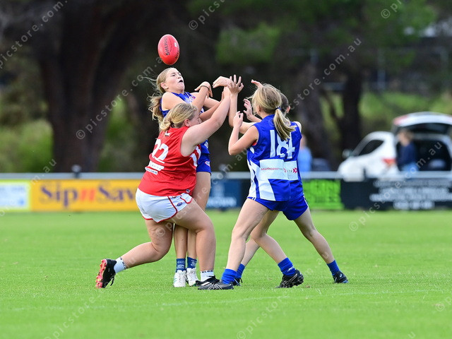 Victor Harbor’s Ava Scott tries to control the ball in the contest during her under 14s match. (Mark Liebich: 474408_06)