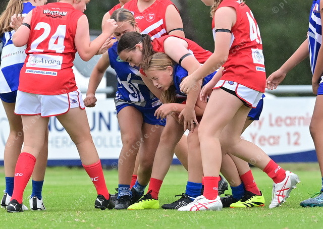 Laying the tackle on Victor Harbor’s Sophie Scotton is Strathalbyn’s Ellira Carman. (Mark Liebich: 474408_07)