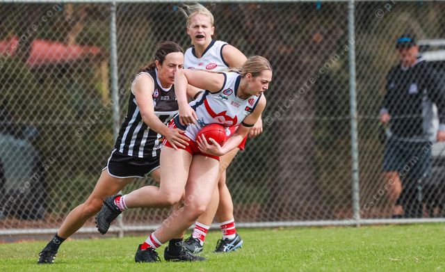Willunga’s Jessica Harris tries to break the tackle during her A grade match. (Jesse Ehlers: 475984_10)