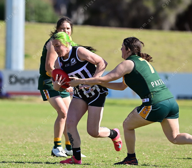 Goolwa-Port Elliot’s Carin Kappler bursts through the pack during her A grade match. (Mark Liebich: 480270_14)