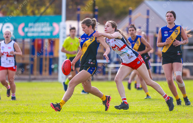 Yankalilla-Encounter Bay’s Jemima Althorp gets boot to ball before she is tackled during her A grade match. (Jesse Ehlers: 481657_04)