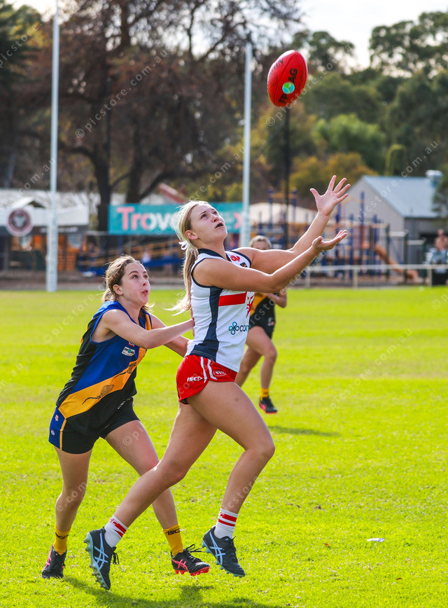 Willunga’s Cleo Guilfoyle takes a mark in front of Yankalilla-Encounter Bay’s AJ Roesler during their A grade match. (Jesse Ehlers: 481657_10)