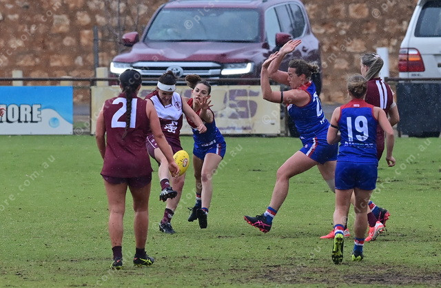 Southern’s Alana Browne kicks the ball just as Great Southern’s Caitlin Radbone catches her during the open women. (Mark Liebich: 483153_03)