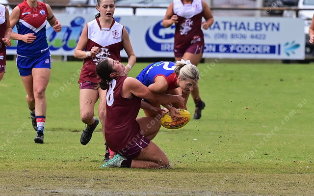 Southern’s Zoe Flesfadar does her best to bring down Great Southern’s Bella Rigby during the open women. (Mark Liebich: 483153_04)