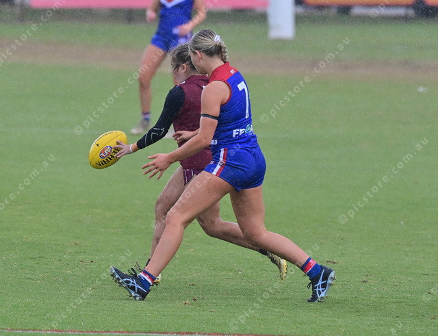 Southern’s Summer Weir prepares to boot the ball before Great Southern’s Cleo Guilfoyle catches her during the open women. (Mark Liebich: 483153_06)