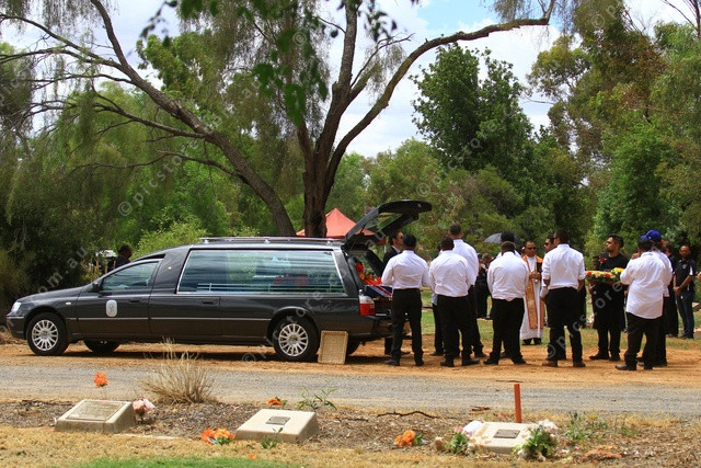 PREPARE: Young men from Tangentyere Council prepare to remove Mr Shaw’s casket from the hearse. (PIC: PHIL WILLIAMS 531822_04)