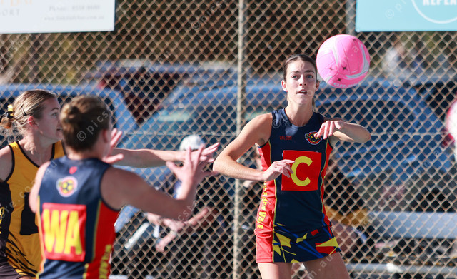 McLaren Vale League centre Taylor Jones pushes the ball to her teammate. (Jesse Ehlers: 480267_10)