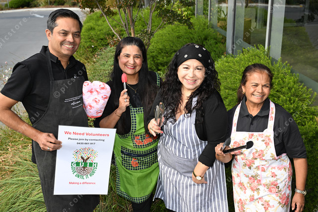 GUIH group hosting a free sausage sizzle. Pic of Garnet Jacob, Veena Moraes, Alejandra O’Connell-Bello and Audrey Gambian. Photo by Damjan Janevski. 469481_01