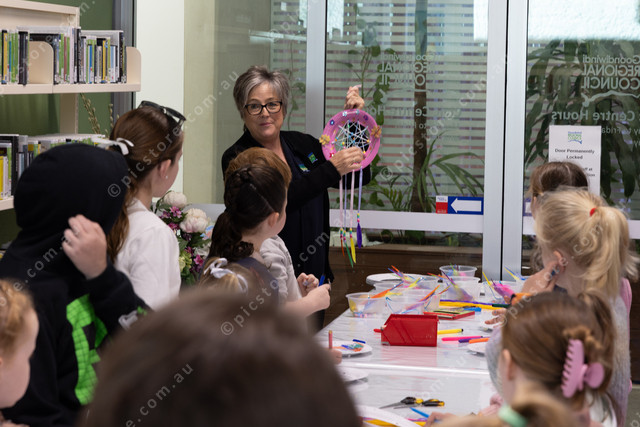 Linda Sheldrake (Goondiwindi Librarian) teaching the kids how to create their dream catchers.