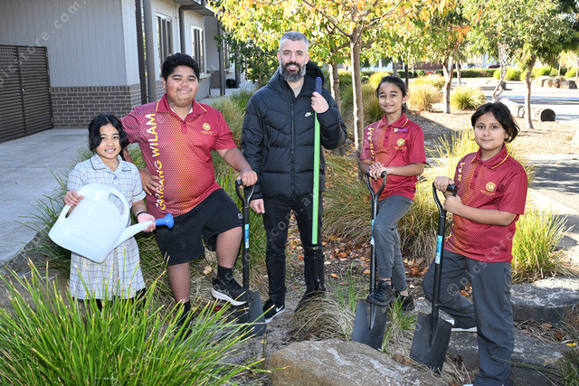 Garrang Willam Primary School have launched a program called Habitat Heroes. Pic of teacher Michael Petaras with students Avee, Preston, Akira and Sirisha. Photo by Damjan Janevski. 482497_01