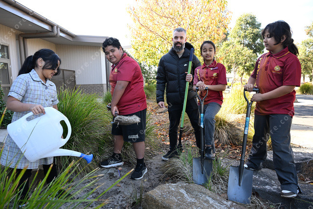 Garrang Willam Primary School have launched a program called Habitat Heroes. Pic of teacher Michael Petaras with students Avee, Preston, Akira and Sirisha. Photo by Damjan Janevski. 482497_05