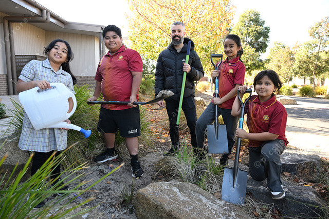 Garrang Willam Primary School have launched a program called Habitat Heroes. Pic of teacher Michael Petaras with students Avee, Preston, Akira and Sirisha. Photo by Damjan Janevski. 482497_06