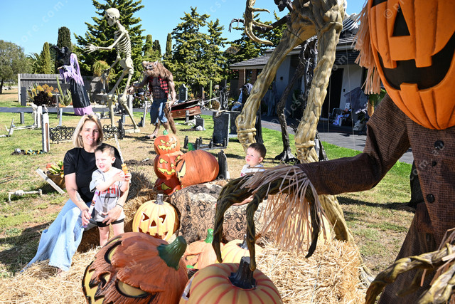 Brookfield resident Jacqueline Licitra has elaborate Halloween decorations on her front yard. Pic of Jacqueline with her grandsons Maddix (3) and Zanon (1). (Damjan Janevski). 510121_06