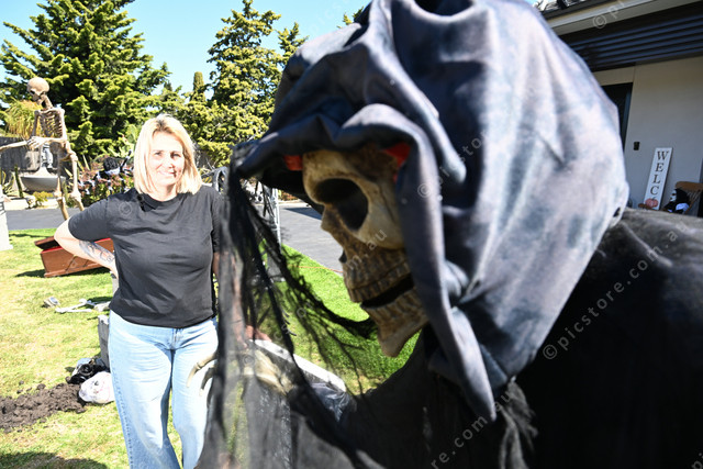 Brookfield resident Jacqueline Licitra has elaborate Halloween decorations on her front yard. Pic of Jacqueline with her grandsons Maddix (3) and Zanon (1). (Damjan Janevski). 510121_12