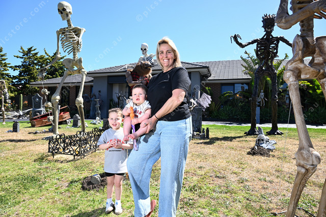 Brookfield resident Jacqueline Licitra has elaborate Halloween decorations on her front yard. Pic of Jacqueline with her grandsons Maddix (3) and Zanon (1). (Damjan Janevski). 510121_14