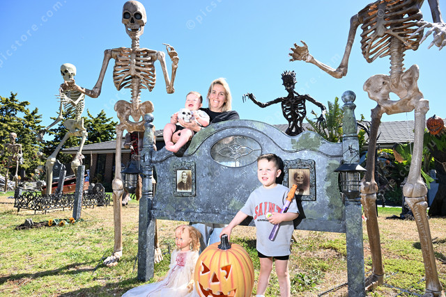 Brookfield resident Jacqueline Licitra has elaborate Halloween decorations on her front yard. Pic of Jacqueline with her grandsons Maddix (3) and Zanon (1). (Damjan Janevski). 510121_15