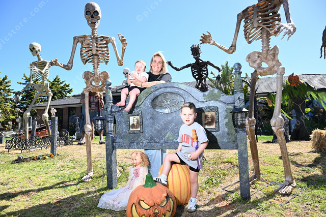 Brookfield resident Jacqueline Licitra has elaborate Halloween decorations on her front yard. Pic of Jacqueline with her grandsons Maddix (3) and Zanon (1). (Damjan Janevski). 510121_16
