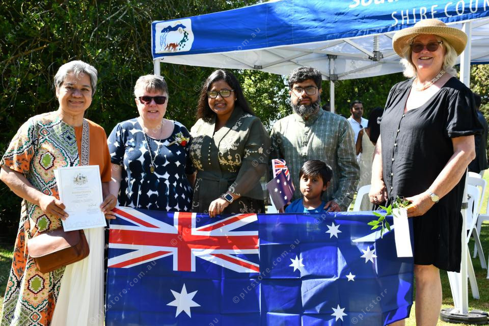 A group of new Australians, Celia Caclini of Hamilton, Julie Simms of Coleraine, Munmun, Parvez, Fawwaz of Hamilton, and Theresa Marchant of Penshurst.