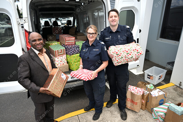 Melton Police Station. Pic of Rev William Osagiede , Sureway International Christian Ministries of Melton, Joanne Mutsearts Acting Sergeant and Luke Prats Sergeant. (Damjan Janevski). 518725_04