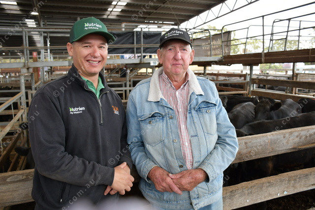Nutrien Livestock agent Rob Aldridge with Digby identity Eddie Hiscock in front of his Angus cattle on Day two of the HRLX Weaner Sales.