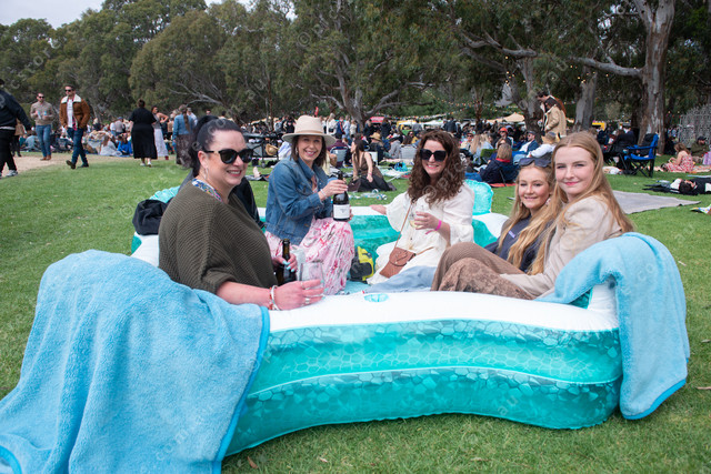 Melissa Hartwell, Mandy Jackson, and Felicity Hartwell, of Strathalbyn, Ella-Rose Evans, of Victor Harbor, and Keely Hutchinson, of Strathalbyn, used a blow-up pool instead of the usual deck chairs and picnic rugs. (Dani Brown: 516310_16)