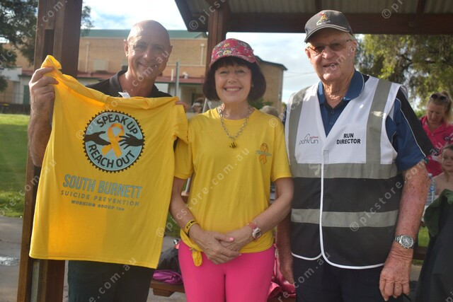 South Burnett Suicide Prevention Working Group advocates Daniel Pelcl and Mayor Kathy Duff with Wondai parkrun director Winston Burrows. 468683_20
