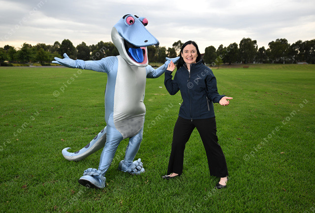 Craigieburn Festival. Pic of mayor of Hume Cr Carly Moore with the festival’s mascot. (Damjan Janevski). 535661_06