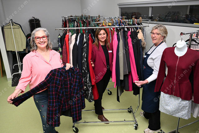 Big Group Hug are collaborating with Ready Set to help provide interview clothes for young people aged 15-24. Pic of Big Hug CEO Bernadene Voss, Sonal Dang staff and volunteer Chris Pope. (Damjan Janevski). 490985_01
