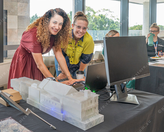 Zahra Gharineiat & Kristy Zemski looking at digital plans of buildings in Ipswich.