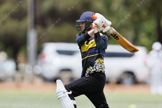 Davies whacks one back past the Enfield bowler. (528125_02)
