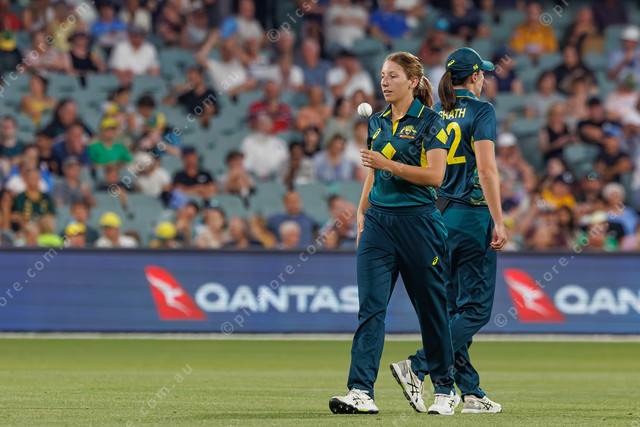 Brown heads back to her mark after a chat with Tahlia McGrath. 456033_03