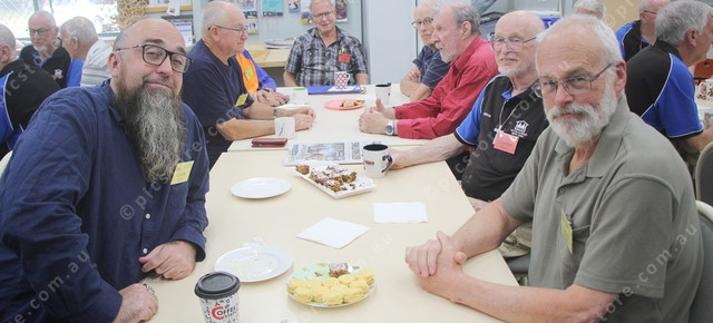 Lucas Bupre and Greg Saltmarsh enjoyed Jim’s birthday morning tea at the Men’s Shed. (Dee Elferink: 537530_02)