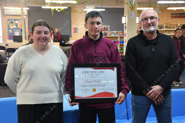 At the John Pirie Secondary School Year 10 event project winners announcement in third place Jaxon Phillips with MTB Showdown, pictured with teacher Ms Arbon and CEO Peter Ackland (Neralie Bailey: 487354_03)