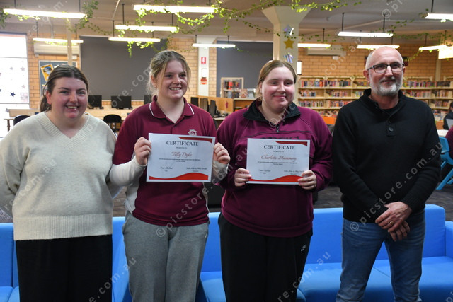 At the John Pirie Secondary School Year 10 event project winners announcement, Public Choice Award went to Ruby Thomas, Tilly Dyke and Charlotte Mummery for Pirie Fear Fest pictured with teacher Ms Arbon and CEO Peter Ackland (Neralie Bailey: 487354_05)