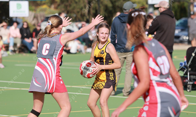 Yankalilla Centre Zoe James is under pressure in her 13 and Under Division 1 game. (Jesse Ehlers) 475999_05