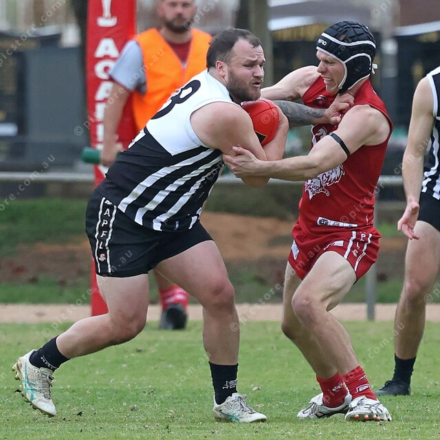 Braiden Tippett gives the fend off to David Haydon. (491117_02)