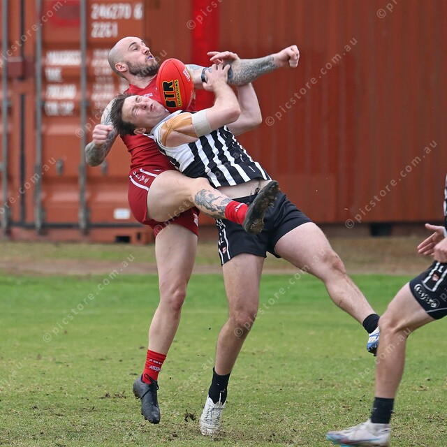 Two Wells’ best-on-ground Aaron Dart crashes into top Magpies forward Brad Wilson to break up the mark. (Michael Slattery: 491117_05)