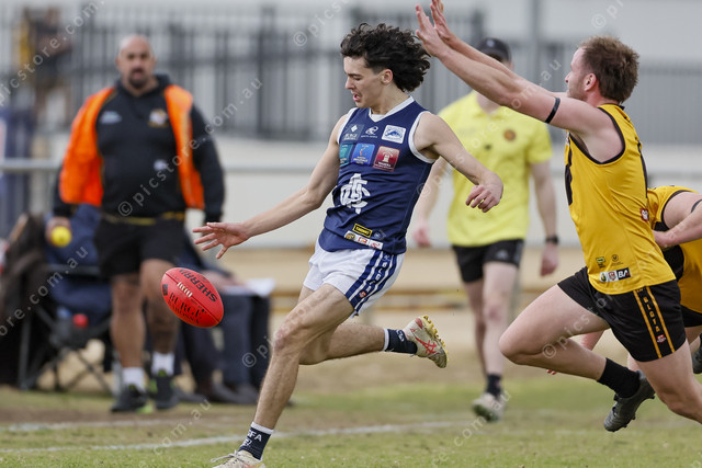 Angaston teenager Kaleb White looks to hook his kick around the attempted smother from Andrew Wright. (491388_02)