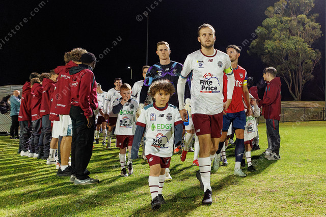 Playford City captain Daniel Ryan leads the Patriots onto the pitch to take on Adelaide United. (Mark Willoughby: 491423_01)