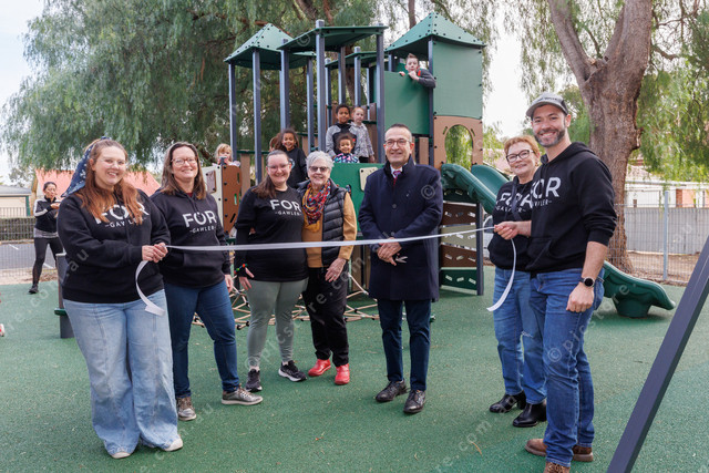 Tony Piccolo preparing to and cutting the ribbon to open the newly refurbished playground at the Gawler Uniting Church. (491099_02)
