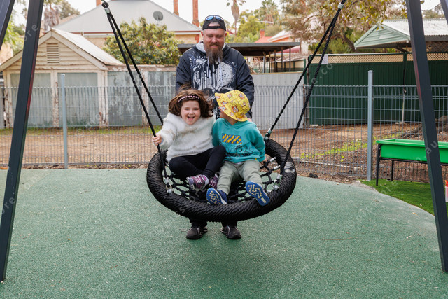 Robert Annells helping Freyja and Seth enjoy the swing at Gawler Uniting Church’s playground. (491099_06)