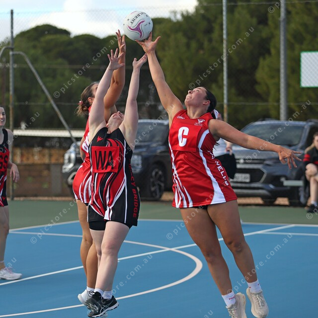 Two Wells’ Sienna Yarwood gets her fingertips on the high pass to outreach Bomber Rachael Burgess. (487494_07)