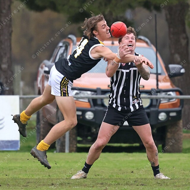 Jesse Burns arrives at the same time as the ball to spoil Mallala’s Matt Naumann. (492504_03)