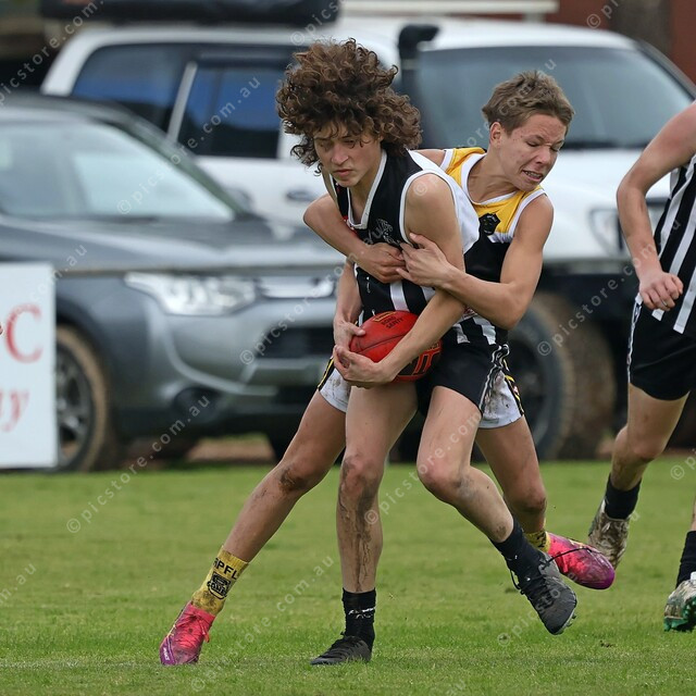 Mallala’s Safin Clark is claimed in a tackle by Ryda Bunker. (492497_04)