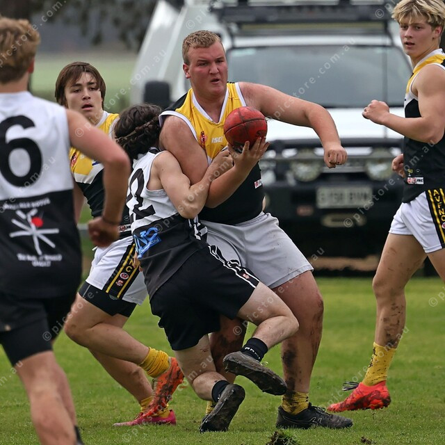 Jordan Roberts powers out a handball as Deegan Davis hangs off him. (492497_10)