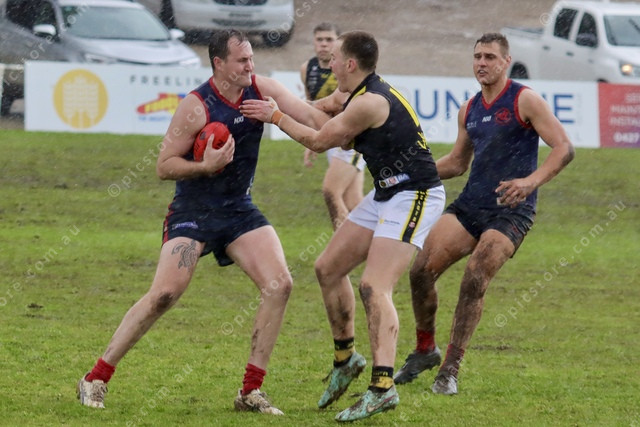 Jonathon Ross pushes away the incoming tackler.