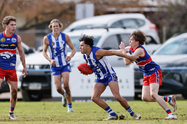 South Gawler’s Justin Miller pulls his arm clear from Dakota Schembri’s attempted tackle. (492491_01)