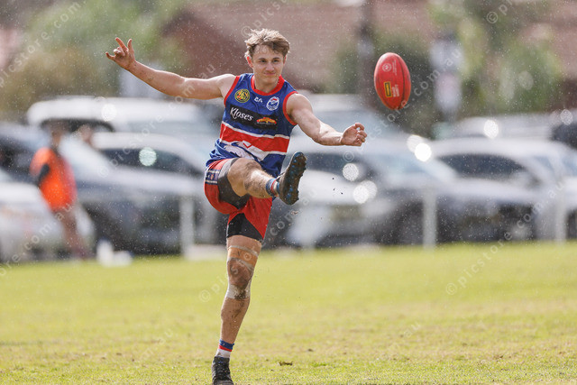 Barossa District’s Sam Young kicks as the rain pours. (492491_09)