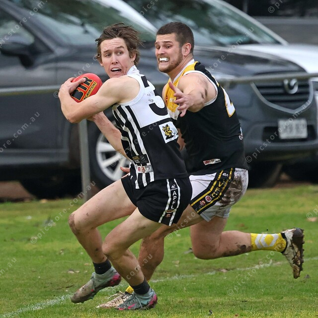 Mallala’s Charlie Baker turns up the sideline away from Blake Pasin. (492690_04)